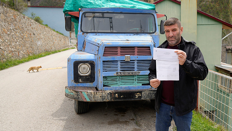 Gümüşhane'nin Torul ilçesinde yaşayan nakliyeci Sinan Çaklı'nın, evinin önünde bulunan ve kış aylarında odunluk olarak da kullandığı çekme belgeli kamyonuna FSM Köprüsü'nden geçiş ihlali yaptığı gerekçesiyle 10 bin 484 TL'lik trafik cezası kesildi.